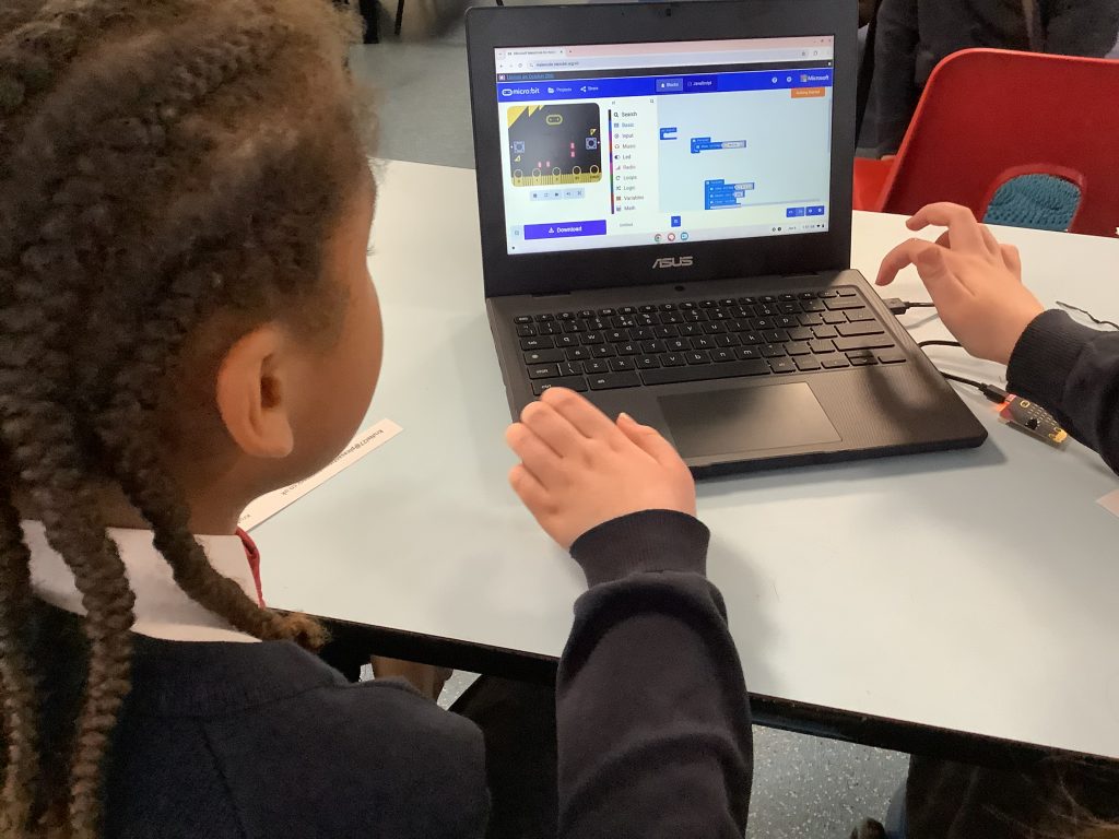 The children used Microbits this afternoon, creating code to display a welcoming message on the Microbit before experimenting with LEDs.
