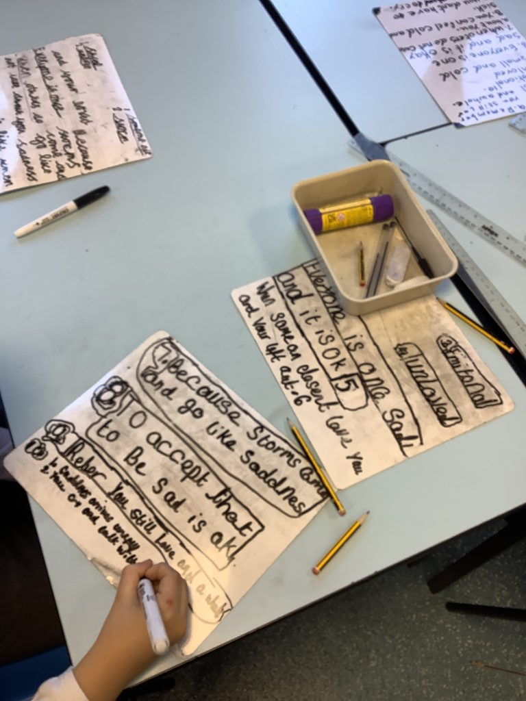 This term in Diversity Day we read a poem about sadness. This helped us know what to do when we feel sad and how to help our fiends if they feel sad. We also learnt about what we can do on our own to help make ourselves feel better.