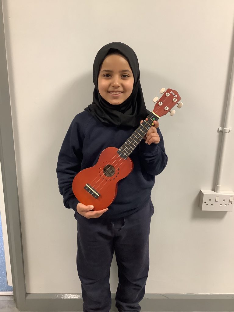In year 4 we do a raffle each full term for the chance for one of the children to win a Ukulele to take home. Amel was our winner this term.