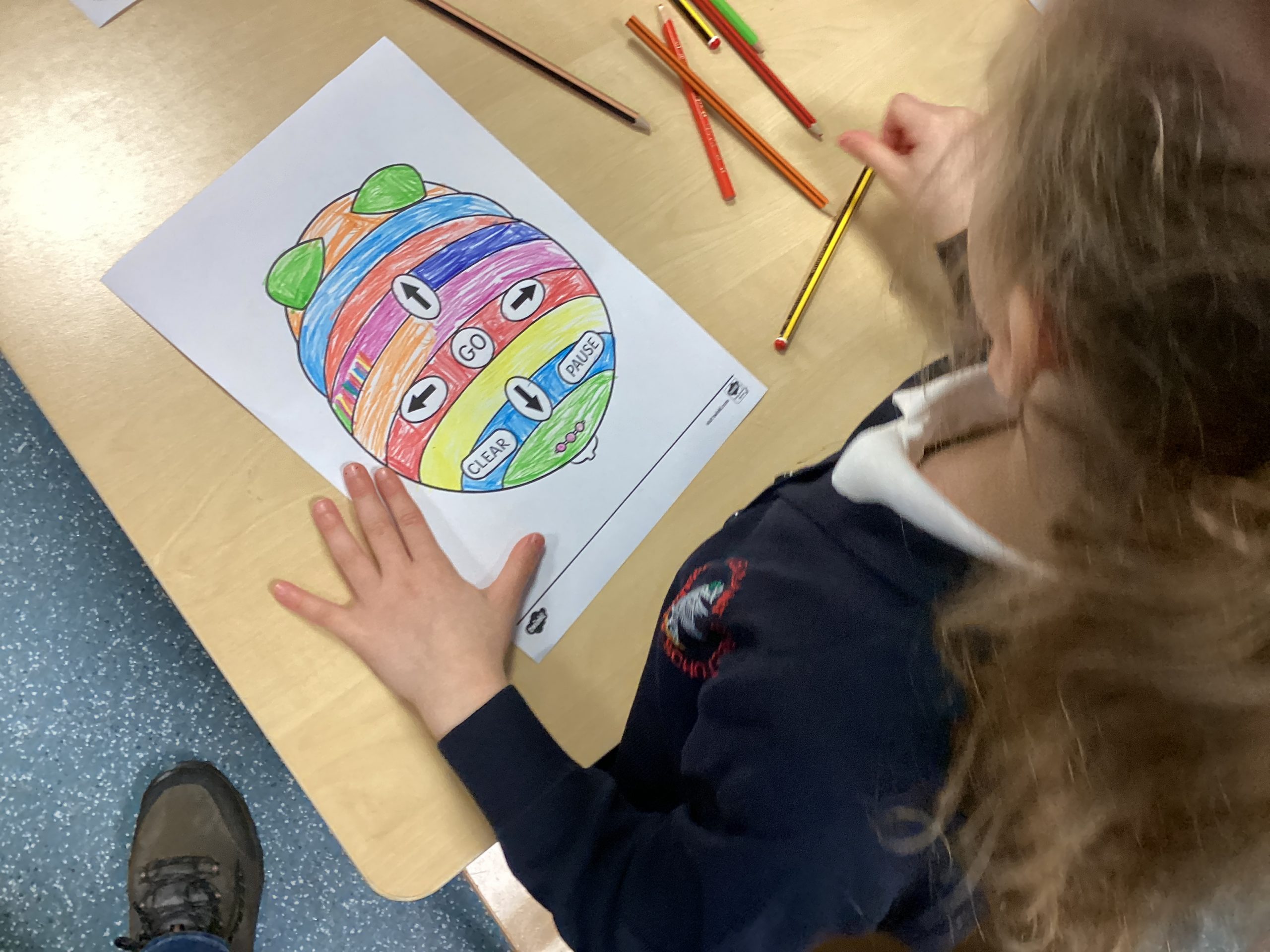 Class 1 started their new unit of work, programming robots. The focus today was on children becoming familiar with a Beebot. Children worked in pairs to explore a Beebot and figure out the different functions, children then created a help sheet on how a Beebot works to use in future lessons.