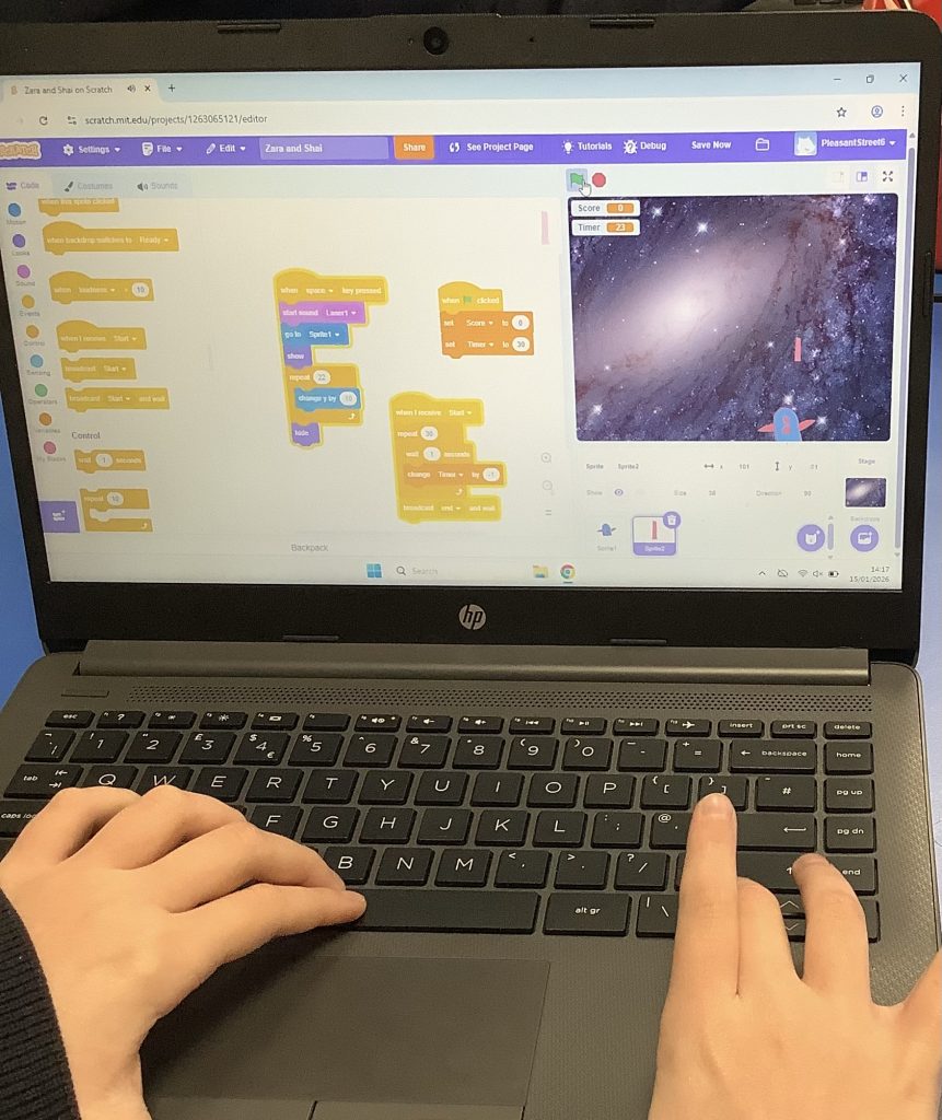 Class 6 have been finishing off their space invaders games. Today we recapped if statements, variables and loops and focused on consolidating our knowledge from the last 2 lessons to add in ‘power ups’ for children to gain bonus lives and time. Children then had time to test out their code and debug any problems that they might have found.