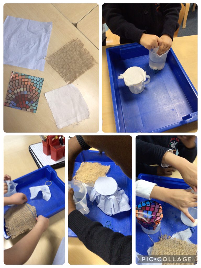 In class today we did our own investigation using four different types of materials.We used hesian,vinyl,cotton and a paper towel. We had to measure 10ml of water and add it to the material and see what happened. We all had different predictions and the vinyl was our top answer and it was the best material we used.