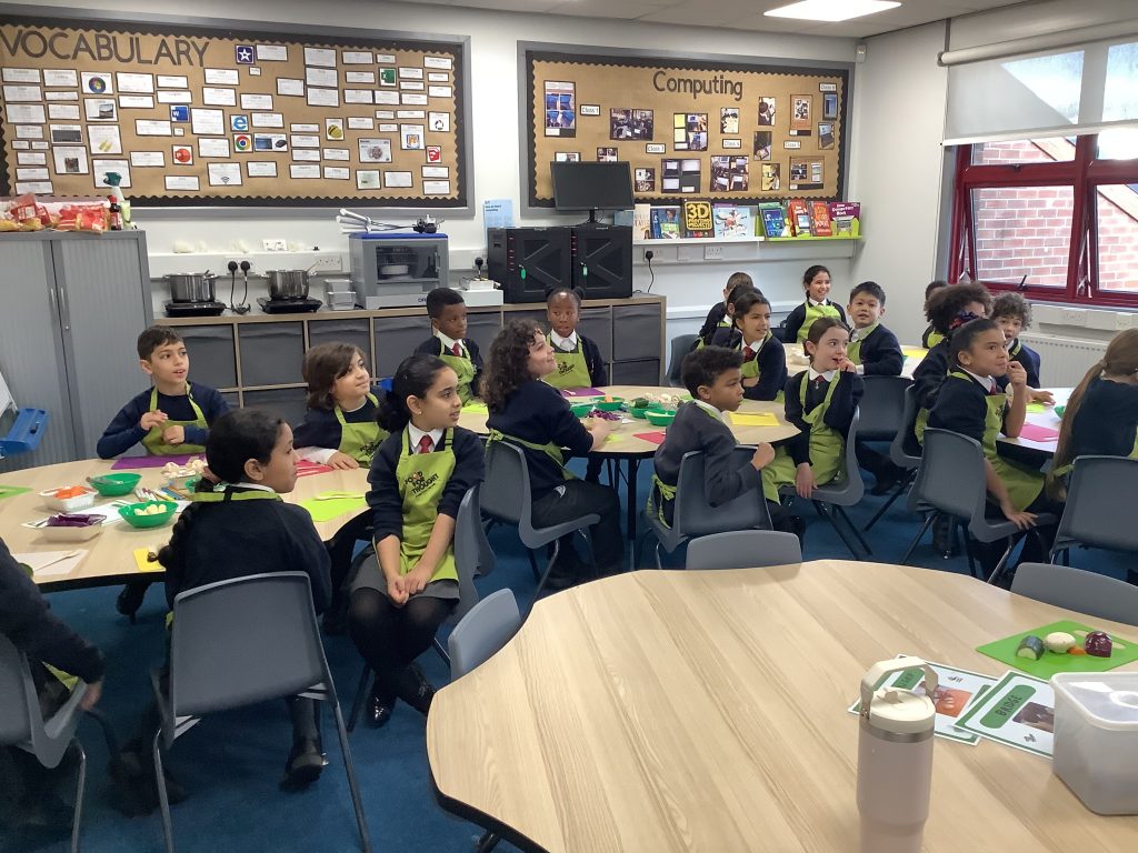 In Year 4, we learned how to make a simple and healthy stir-fry. The children practised safe cutting techniques, learning how to hold a knife correctly and chop a variety of vegetables such as peppers, carrots, mushrooms, cabbage and also learnt how to press garlic. The lesson helped them build confidence in the kitchen while exploring healthy eating and teamwork. Year 4 really enjoyed this lesson as there was a lot of teamwork and learning together.