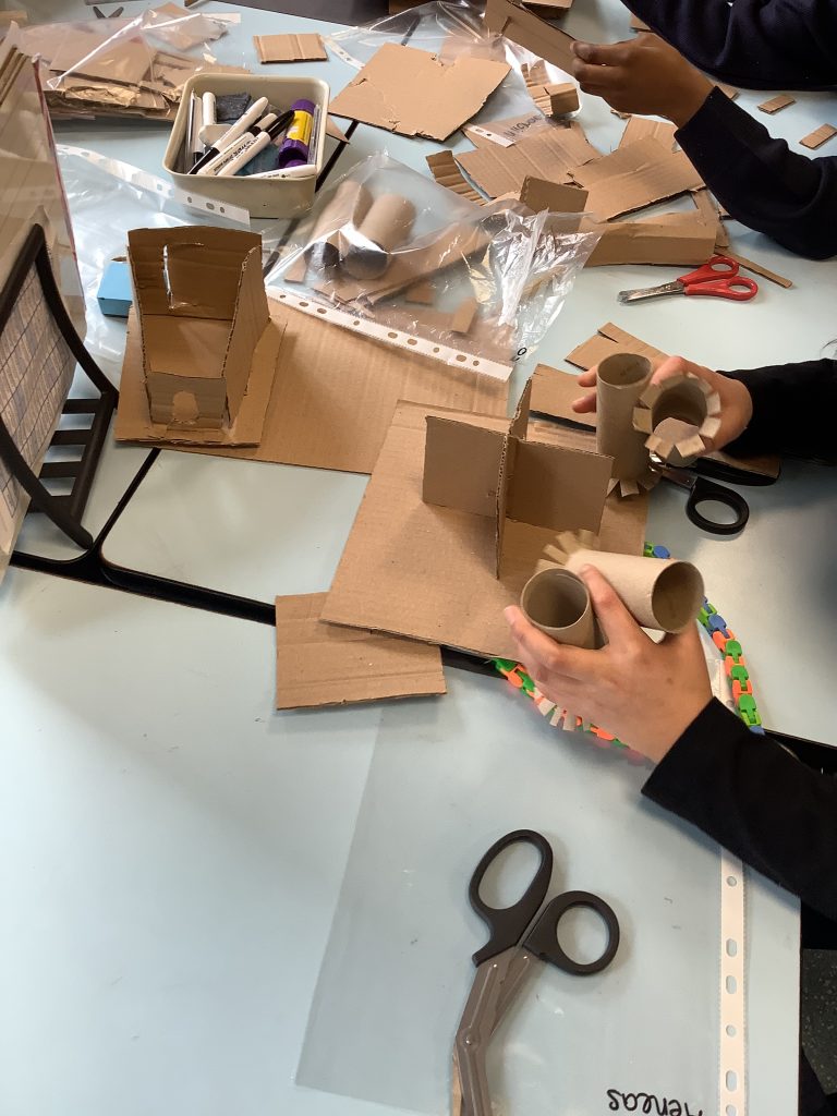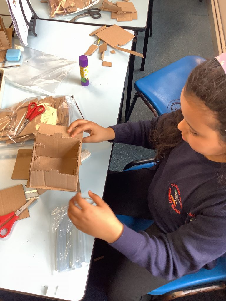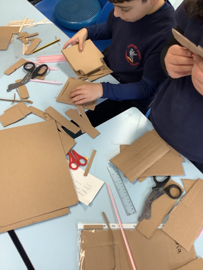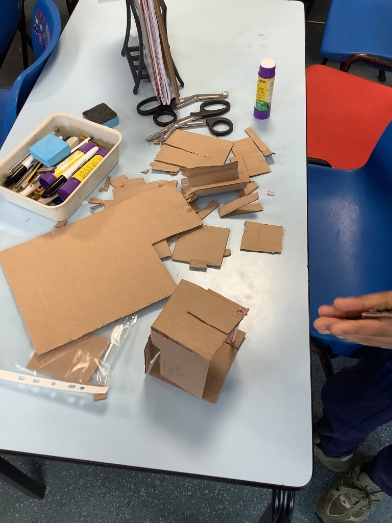 The class started making their chairs this afternoon, using cardboard, tape and lots of hard work!