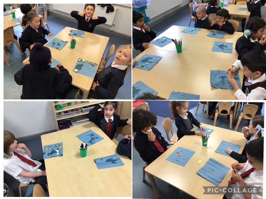 In D.T we are learning about fruit salads. Today we tasted different fruits to see what fruits we liked and disliked. The children rated the fruit out of 10.