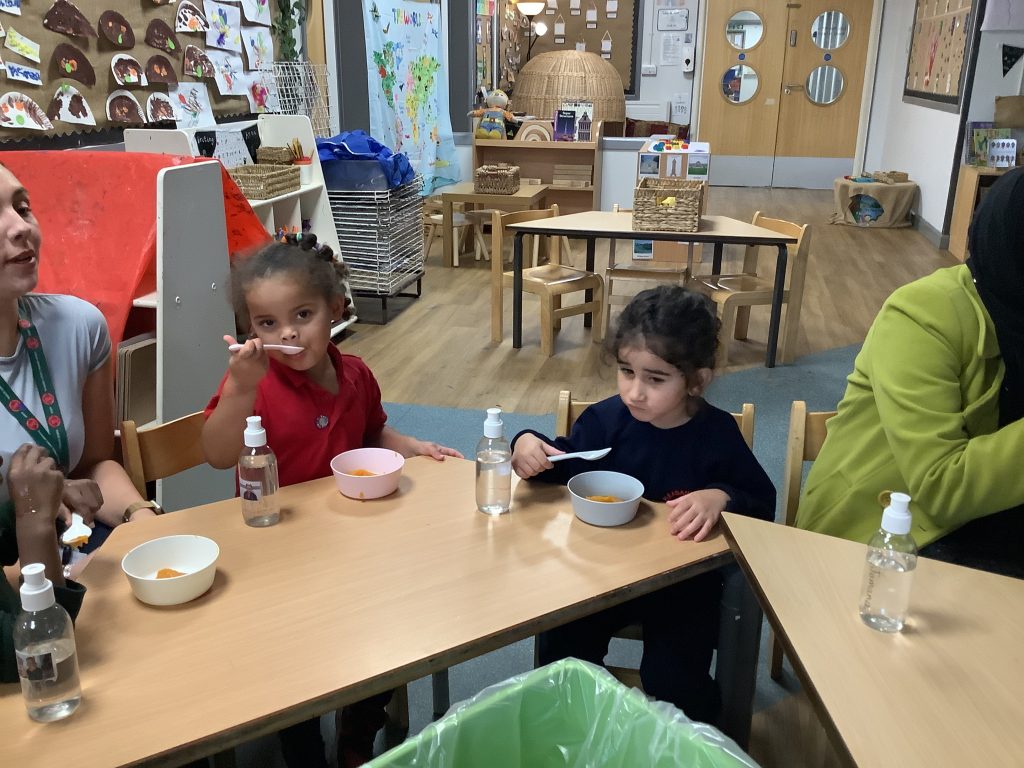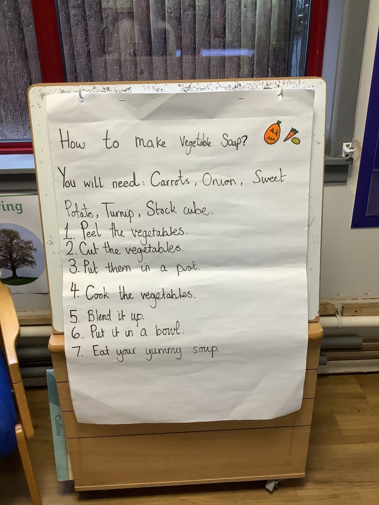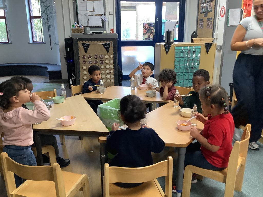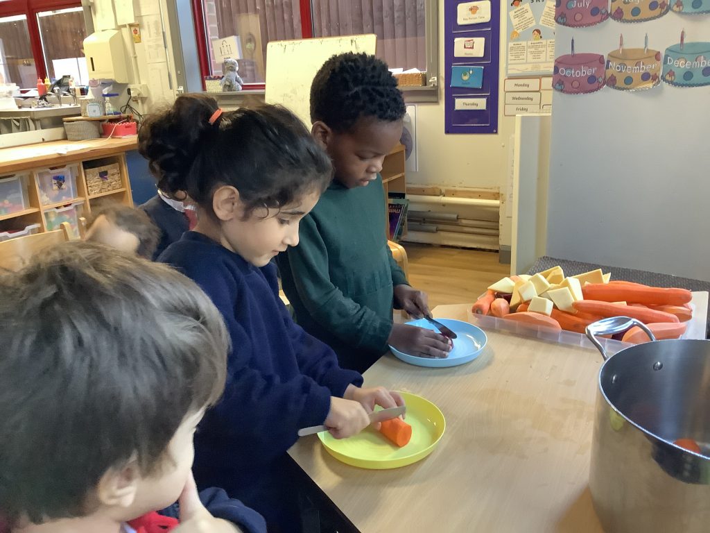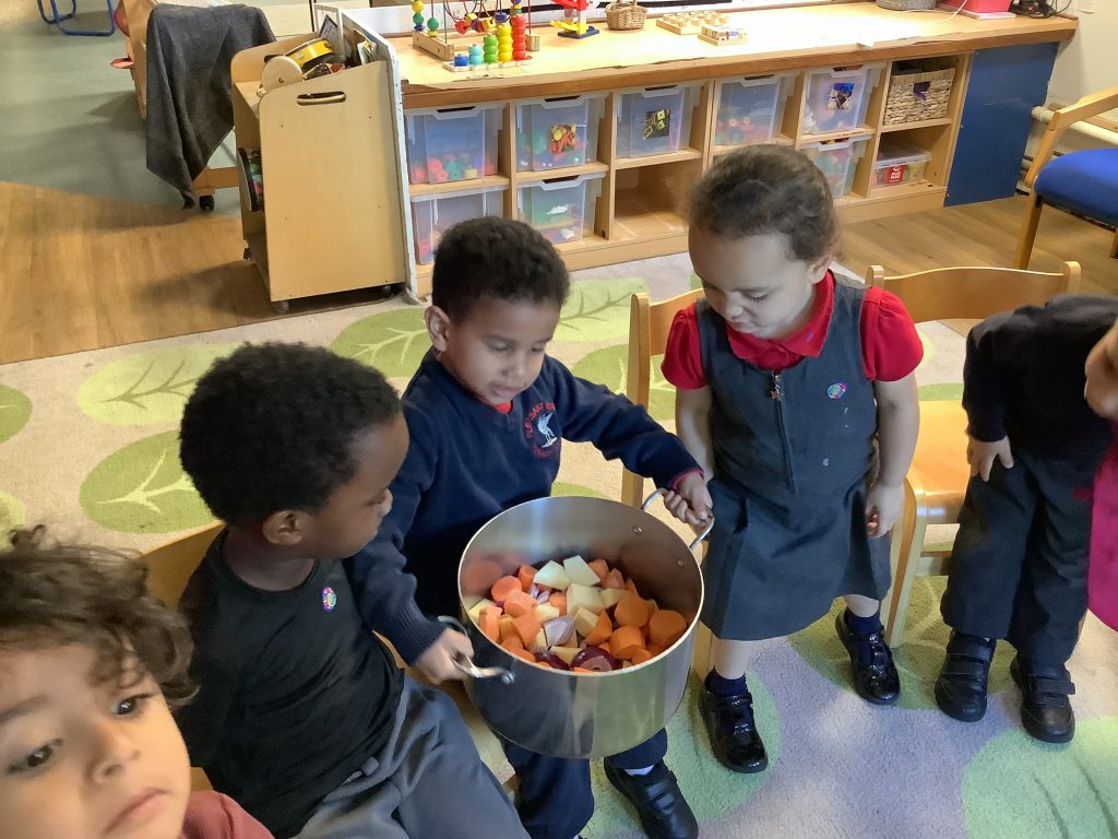 This week, our Nursery children enjoyed reading Pumpkin Soup by Helen Cooper. They had great fun pretending to make their own soup in the tuff tray before helping to wash, chop, and smell a variety of real vegetables. Together, the children created a set of instructions for how to make pumpkin soup, using lots of fantastic language to describe what they were doing. The teachers then cooked and blended the soup, and everyone enjoyed tasting their delicious homemade pumpkin soup for snack time. It was a wonderful sensory and storytelling experience that brought the book to life!