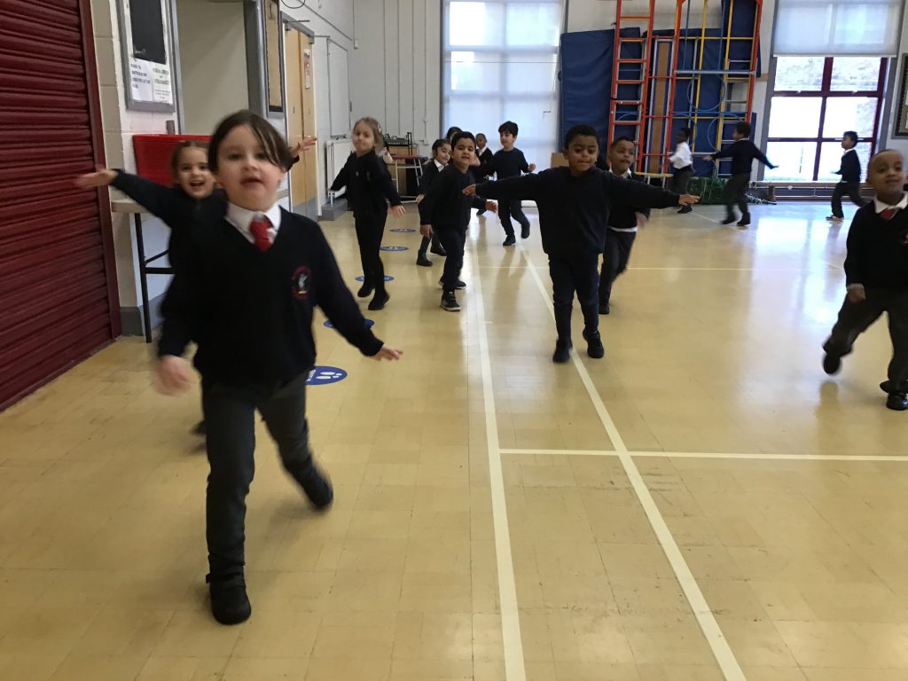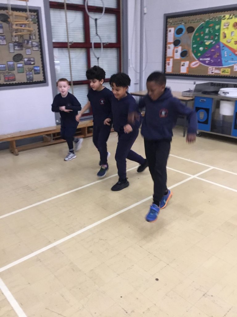 Reception started their PE lesson with a warm up game of chase the dogs, using their running, listening and problem solving skills.