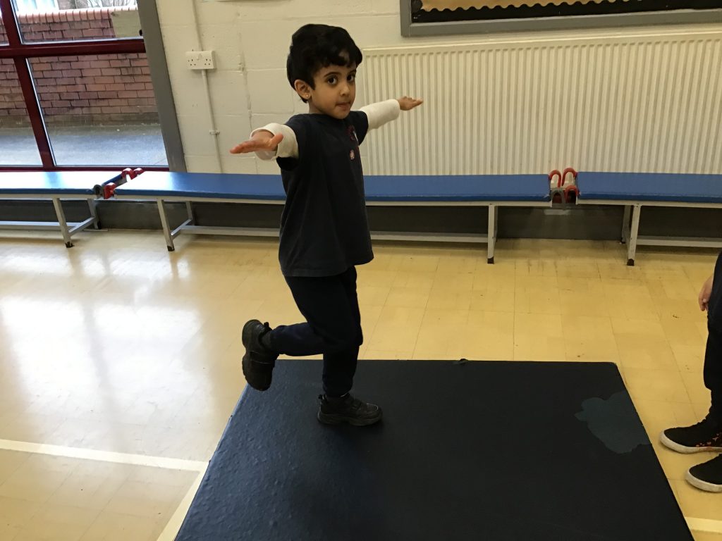 During this week’s PE lesson the children thought about balancing using small or large body parts. We listened to the adults instructions about how many points to use then the children chose different ways to balance and hold position for a few moments, developing their gross motor skills, coordination and balance.