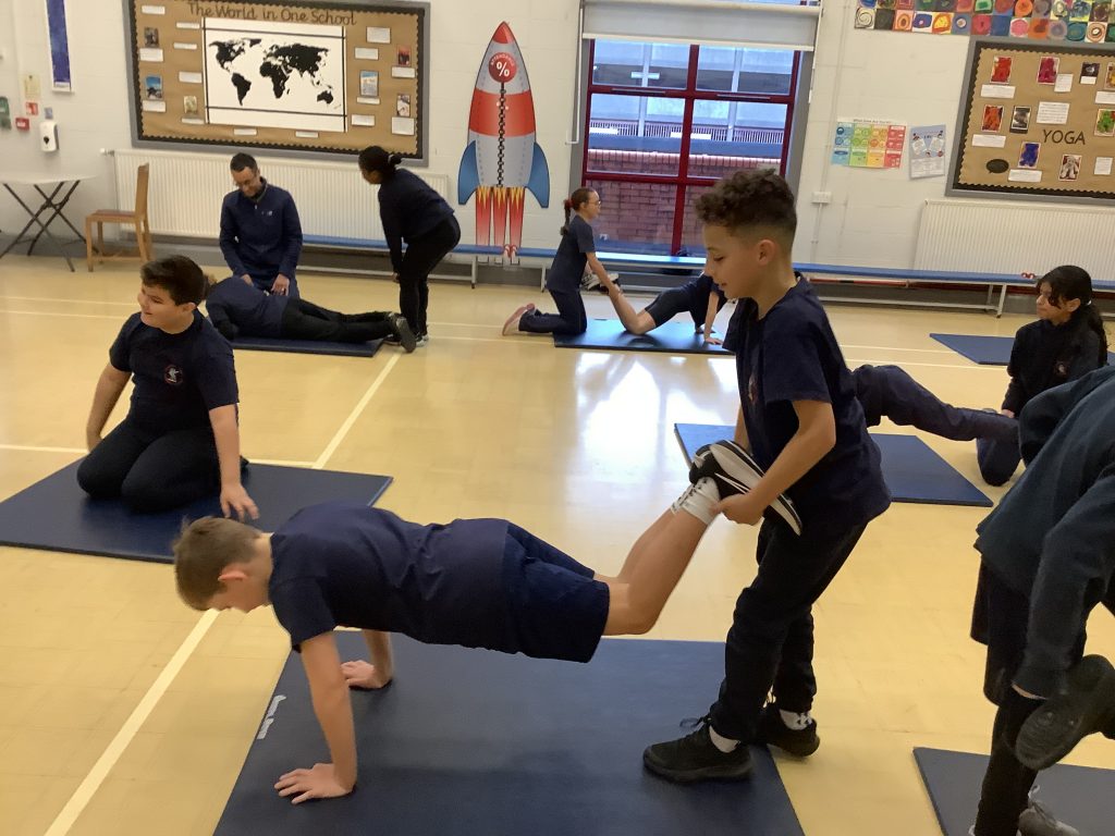In P.E this morning, Class 6 were using their teamwork skills to support each other.