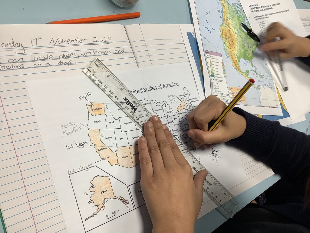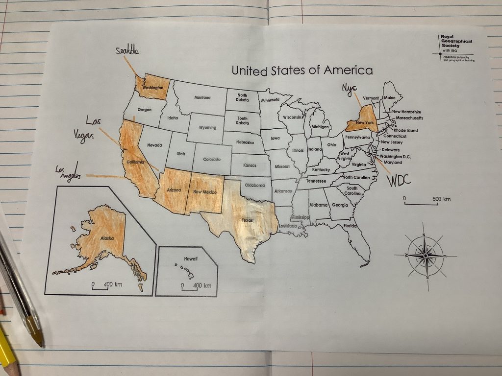 The class started their North America topic this afternoon by finding settlements on a map of the U.S.A.