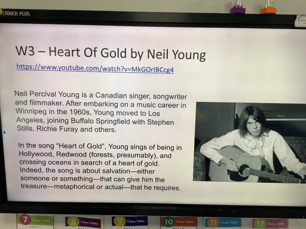 The class listened to the beautiful ‘Heart of Gold’ by Neil Young this afternoon! The children commented on the guitar, harmonica and lyrics!