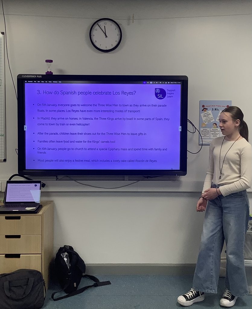 We have a previous class 6 student here today teaching us about the celebration of Los Reyes (of the kings) and showing us some Spanish Christmas traditions. We looked at some traditions foods and discussed any similarities between Christmas here and Spain.