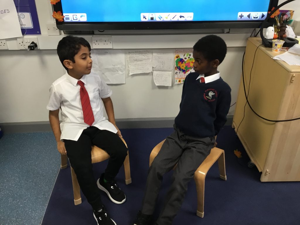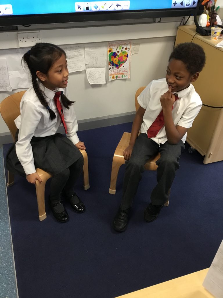 During Diversity Day class 3 enjoyed reading ‘Two Monsters’ written by David McKee. The book is about two monsters who live on either side of a mountain. Sometimes they talk through the hole in the mountain, but they never see each other. One evening, they get into a silly argument about whether day is departing or night is arriving, which escalates into a rock throwing fight, which eventually destroys the mountain, and enables the monsters to see each other’s point of view and live together as friends. We spoke about the themes of this book and identified themes such as differences, communcation and friendship.