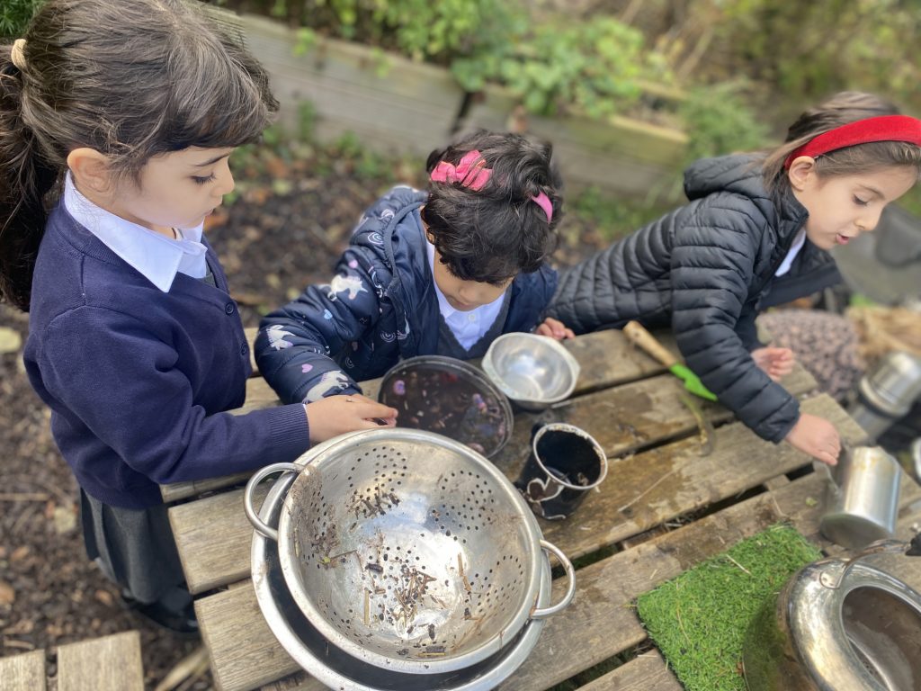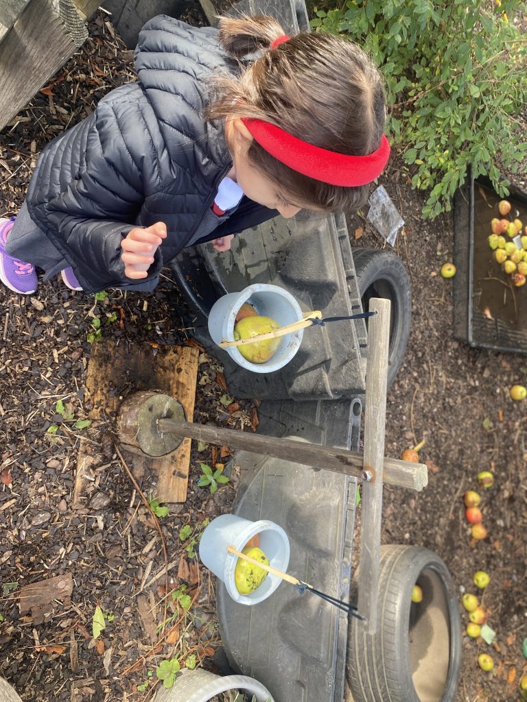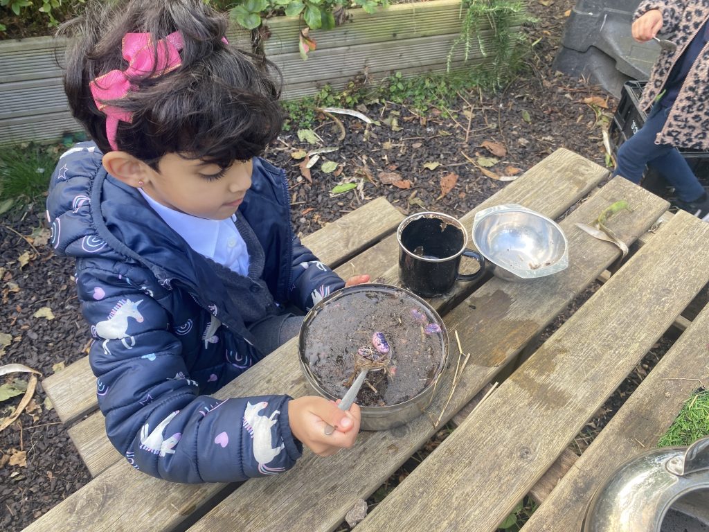 We have had lots of fun exploring the enhancements in the mud kitchen this week. Some of us have planted beans in the hope that a beanstalk might appear. In the mud kitchen we used sieves and spoons to separate the beans from the other ingredients. Some children collected apples from the garden and used the scales to compare the weight of the apples.