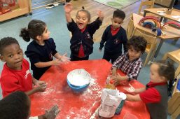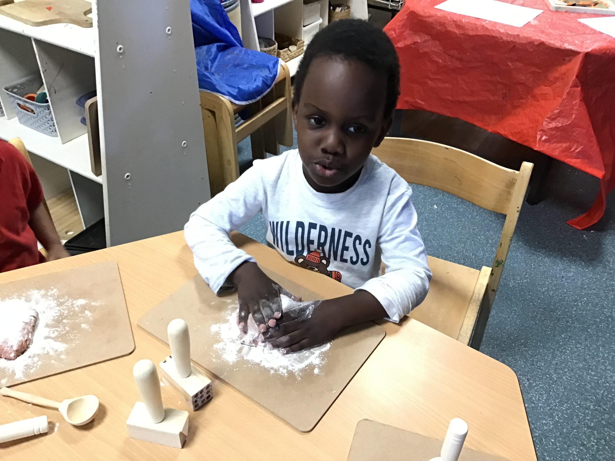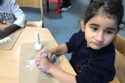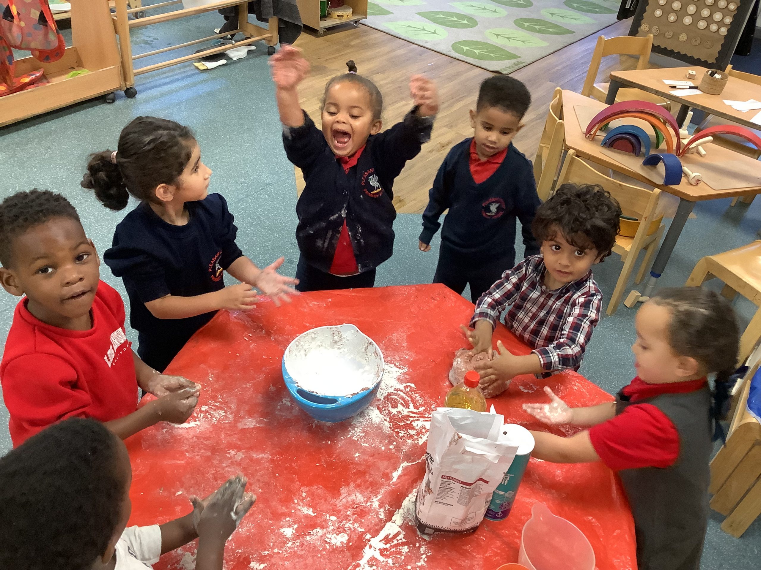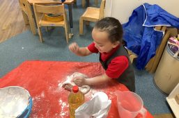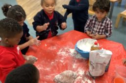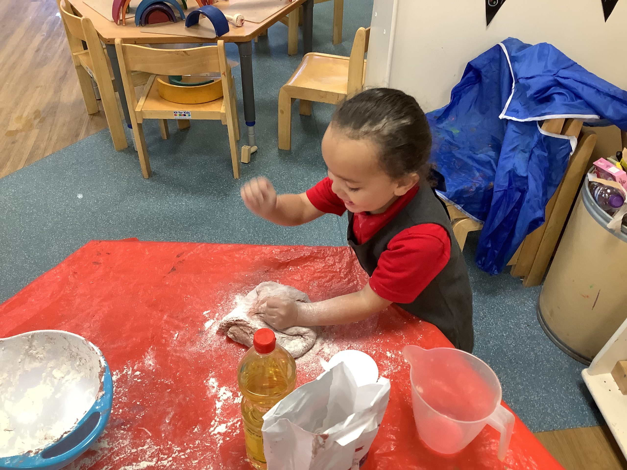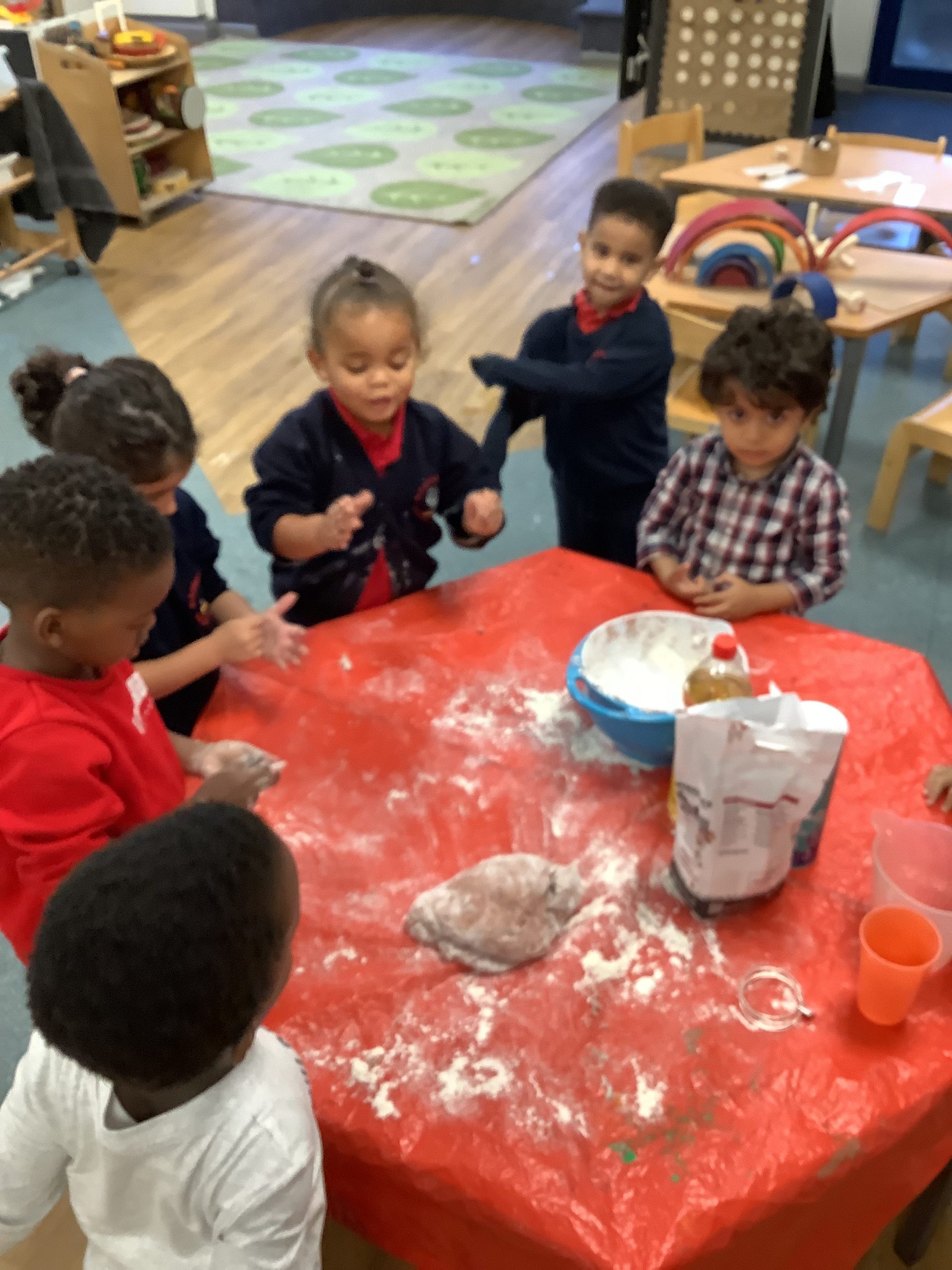 The children worked together to make play-dough, we gathered all the ingredients that we needed and measured them using a cup. The children took turns adding an ingredient each, then we got messy using our hands to knead the dough.