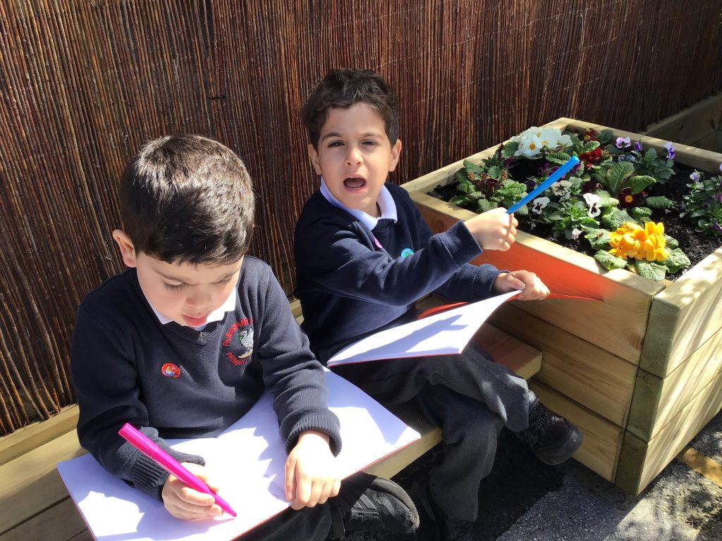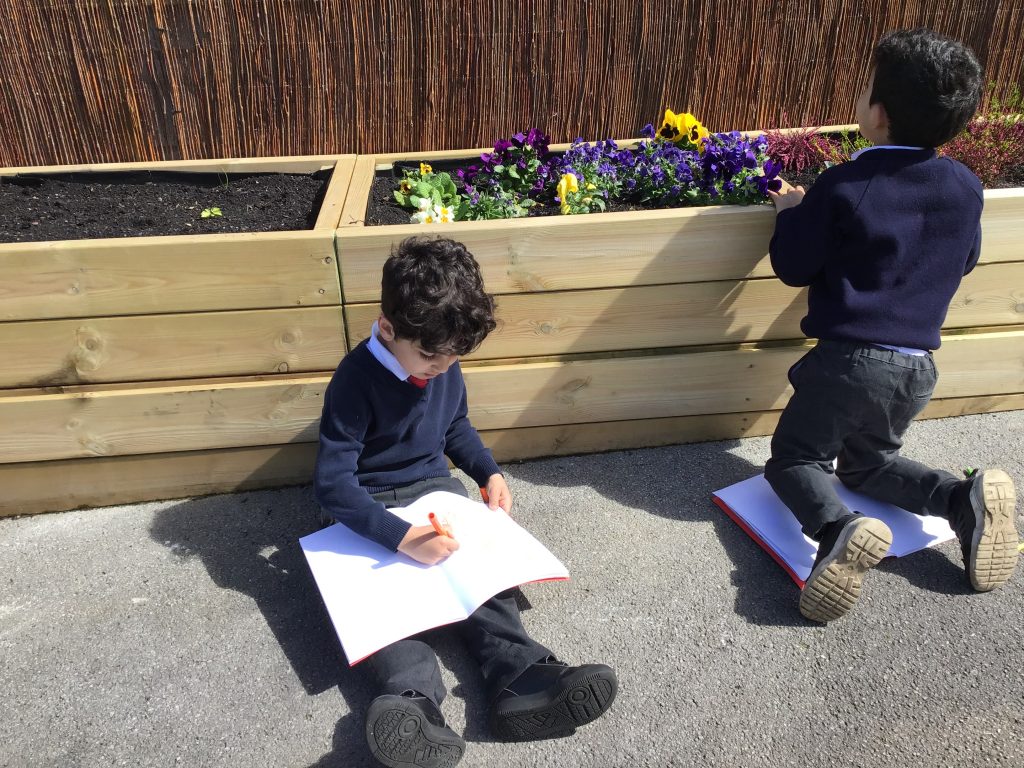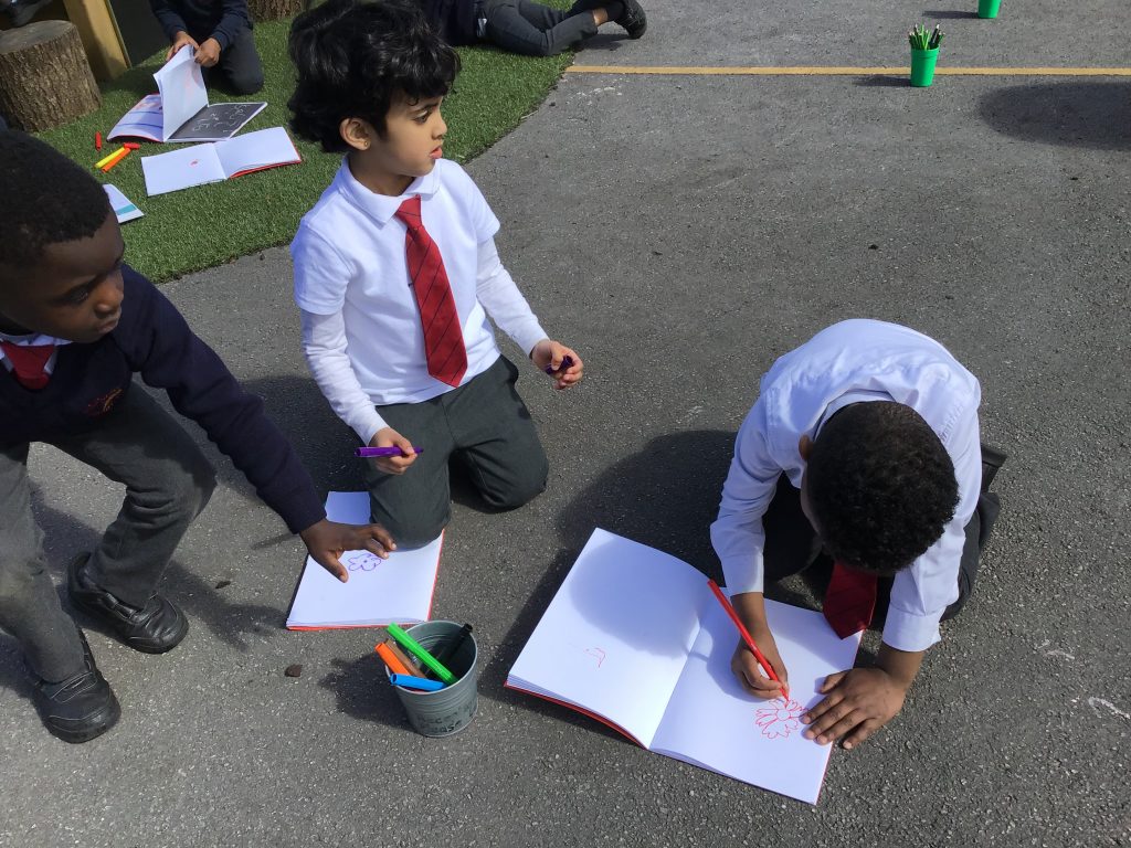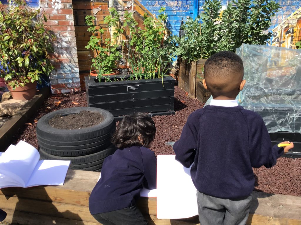 We have been listening to a story called The Extraordinary Gardener by Sam Boughton, today the children looked at the illustrations in the text talking about the colours,flowers and plants in the story. Then we took some art materials into the school allotment area to draw our own pictures of the flowers and plants in our garden. The children were very excited using their sense to explore the area with their friends.