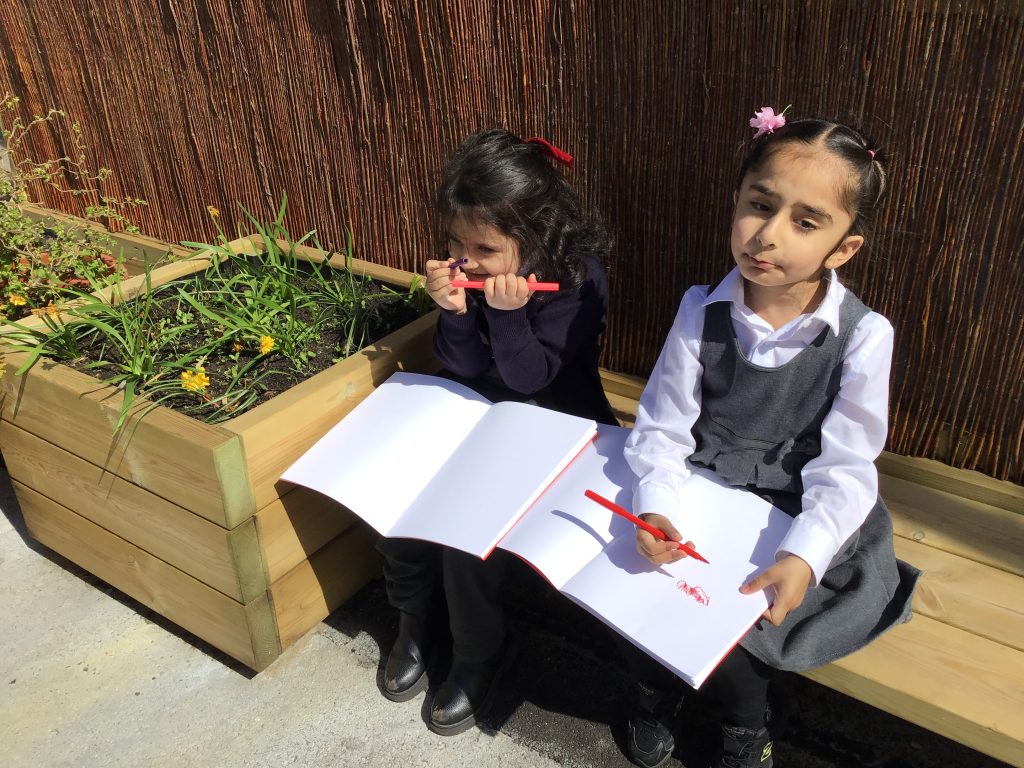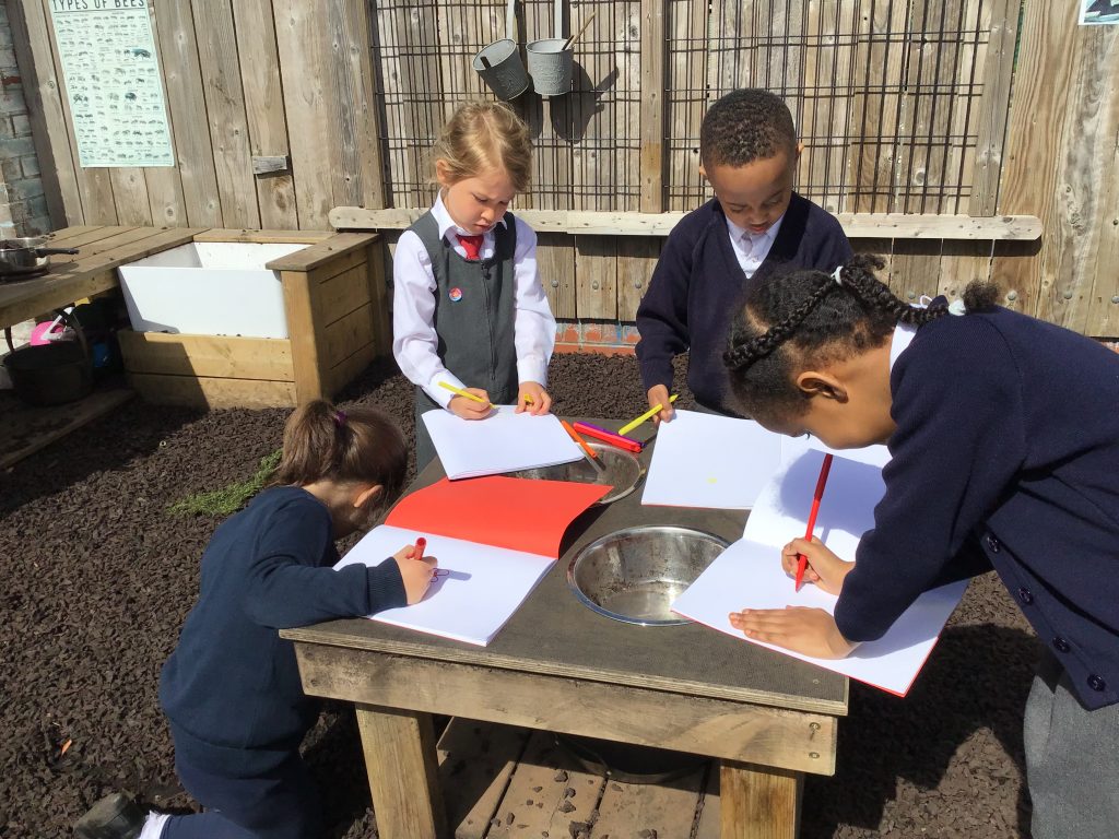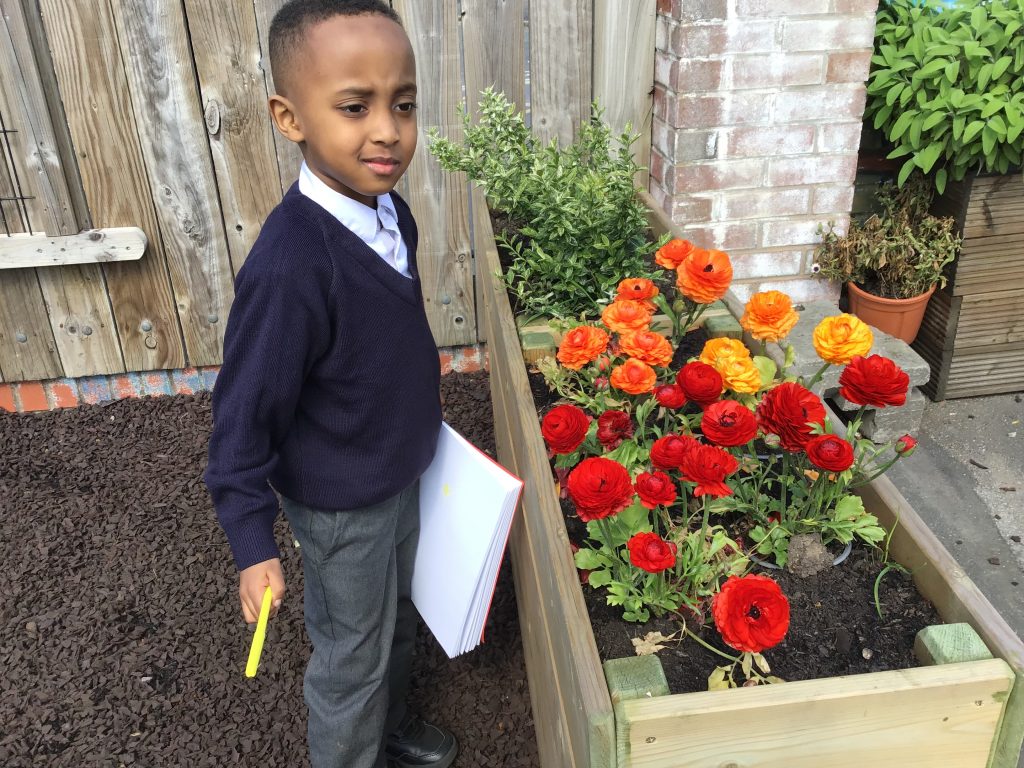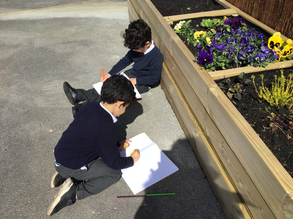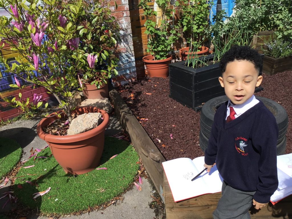 We have been listening to a story called The Extraordinary Gardener by Sam Boughton, today the children looked at the illustrations in the text talking about the colours,flowers and plants in the story. Then we took some art materials into the school allotment area to draw our own pictures of the flowers and plants in our garden. The children were very excited using their sense to explore the area with their friends.