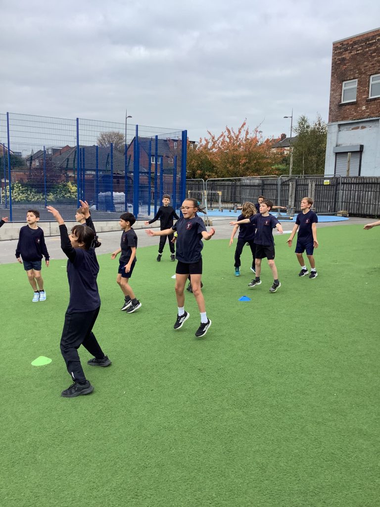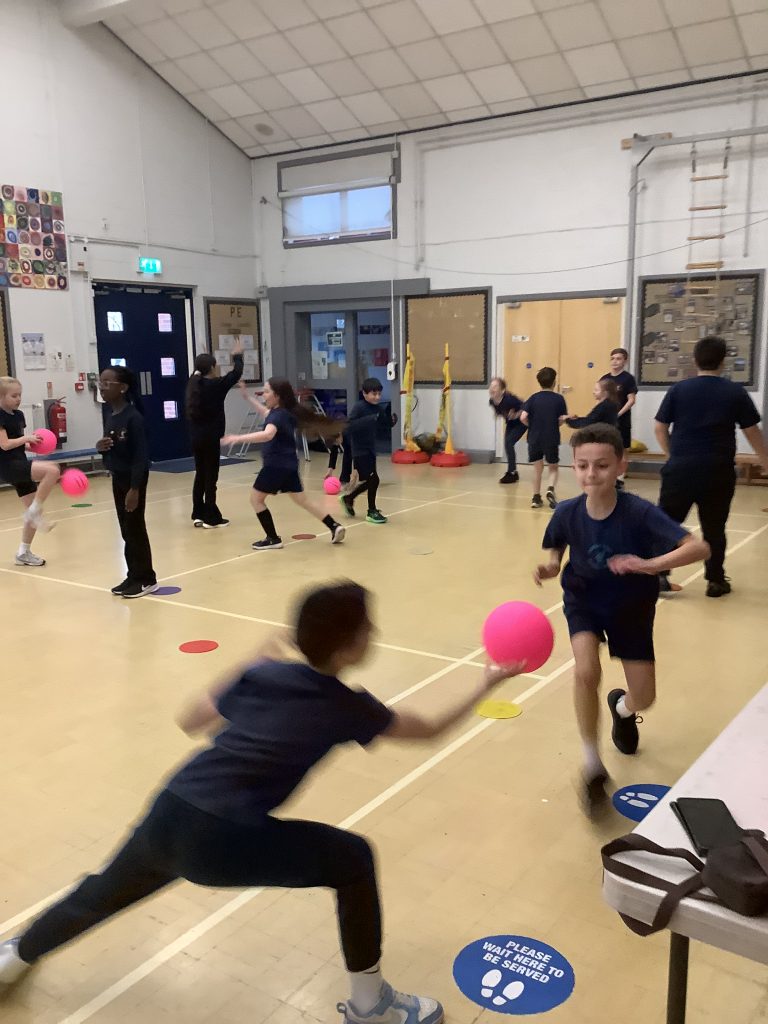 Reception started their PE lesson with a warm up game of chase the dogs, using their running, listening and problem solving skills.