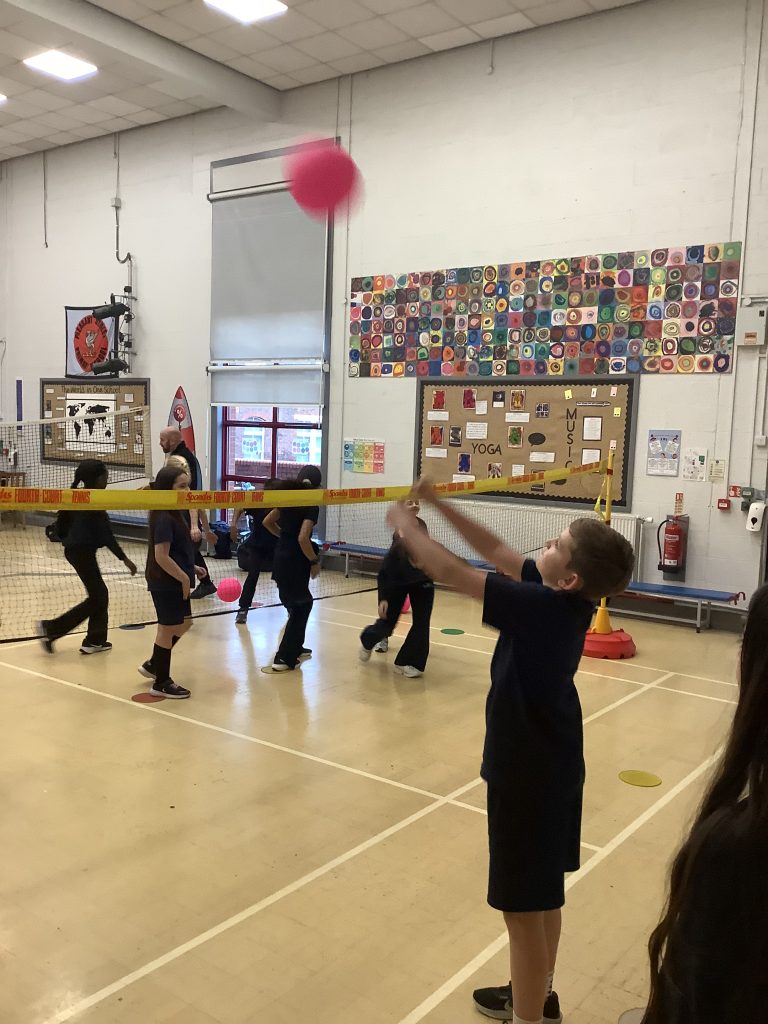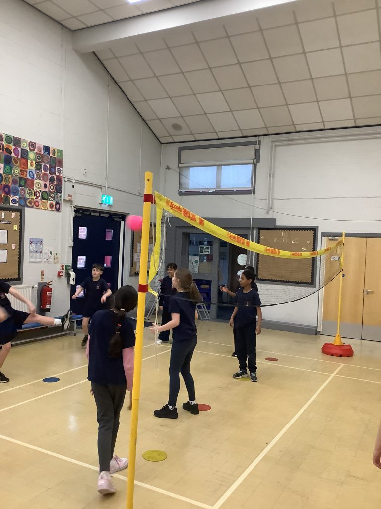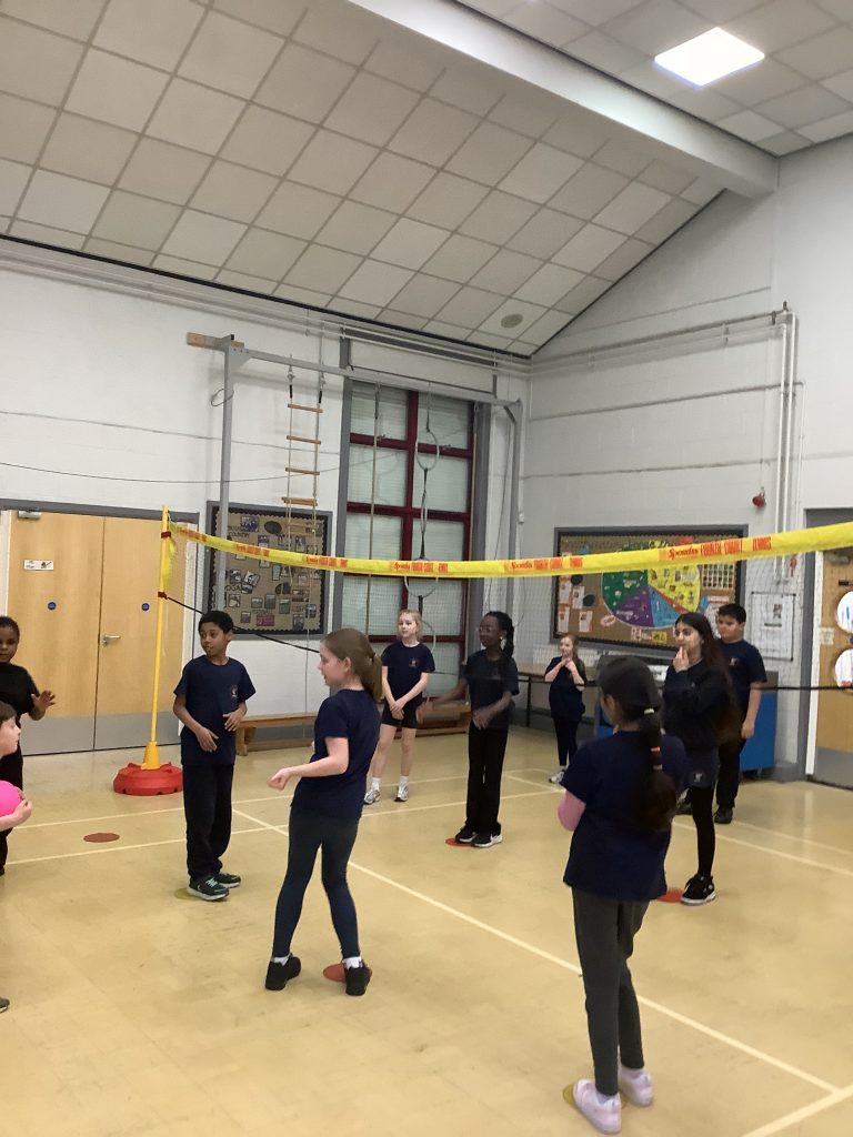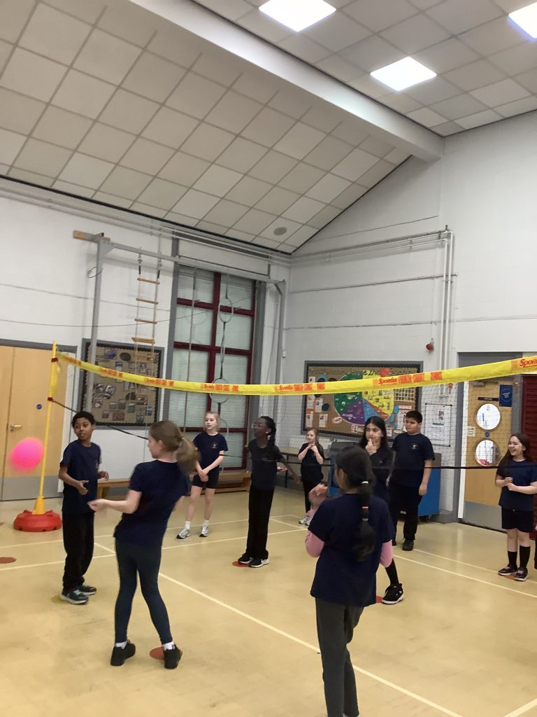 Class 6 are showing off new skills in P.E today. Learning all about badminton and working in teams for some friendly competition.
