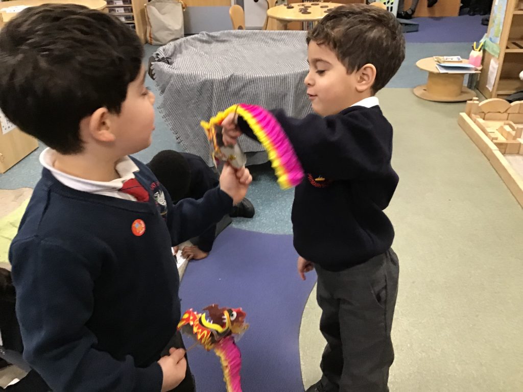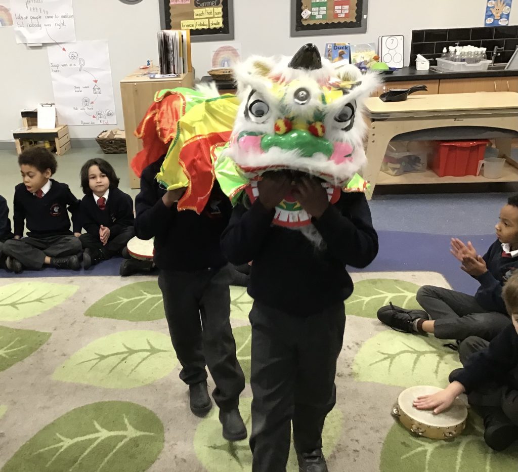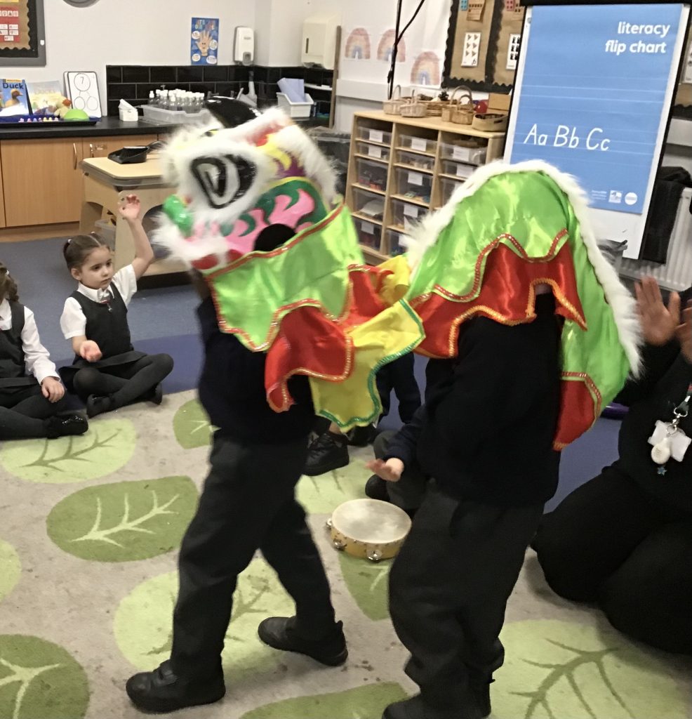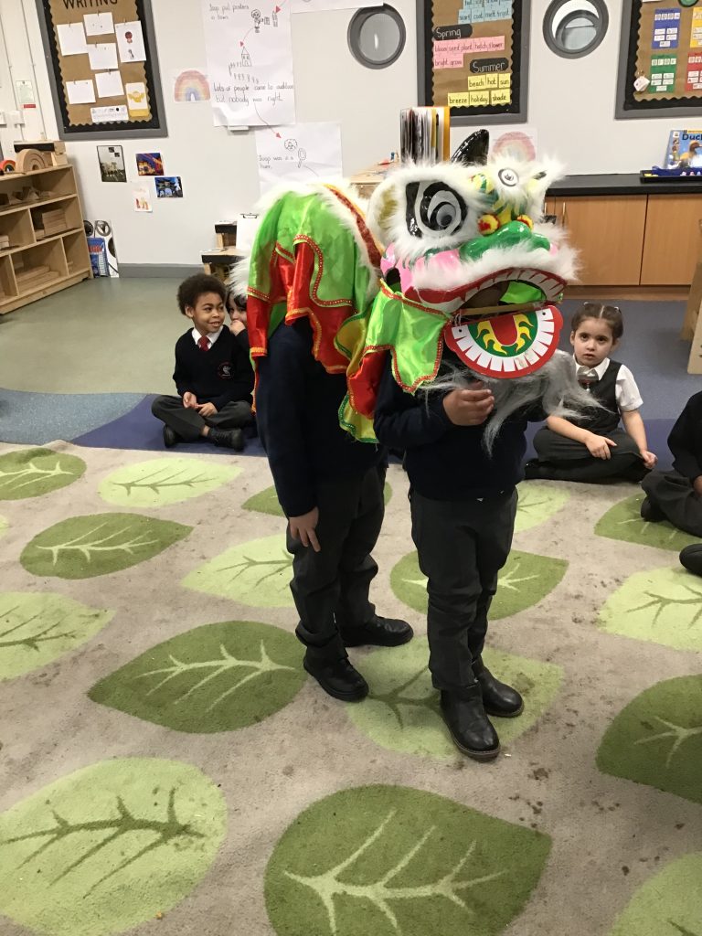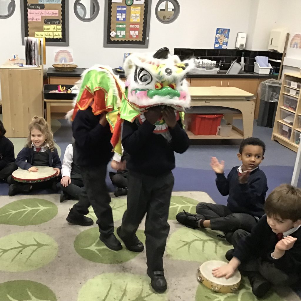 We have been thinking about different celebrations, this week the children enjoyed listening to a book about the how people celebrate the Lunar New Year. We then took turns to wear the lion costume and take part in the Chinese lion dance. Some children played the drums and tambourine to create the music for our dance.
